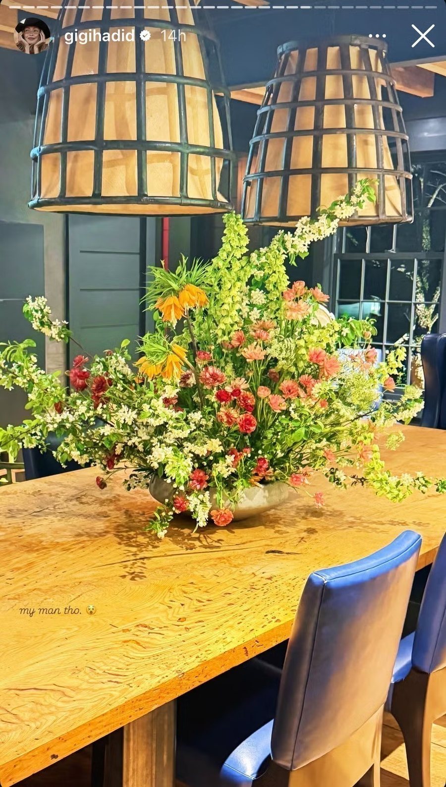 Bëhej fjalë për një aranzhim të madh me lule në nuanca të pjeshkës, kumbullës, arit dhe të bardhës, që tërhiqte menjëherë vëmendjen. Pa shumë fjalë, Gigi zgjodhi një mbishkrim të shkurtër, duke lënë imazhin të flasë vetë për gjestin.